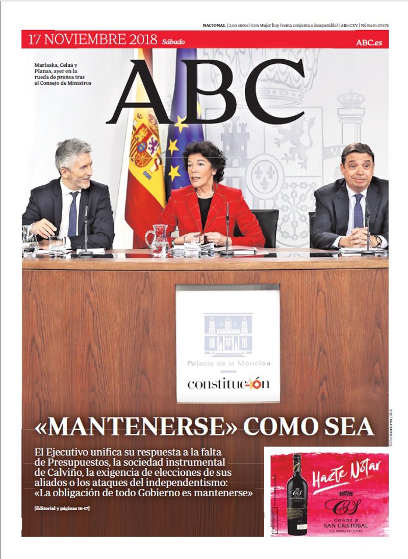 ABC: ""Mantenerse" como sea. El Ejecutivo unifica su respuesta a la falta de Presupuestos, la sociedad instrumental de Calviño, la exigencia de elecciones de sus aliados o los ataques del independentismo: "La obligación de todo Gobierno es mantenerse"".
