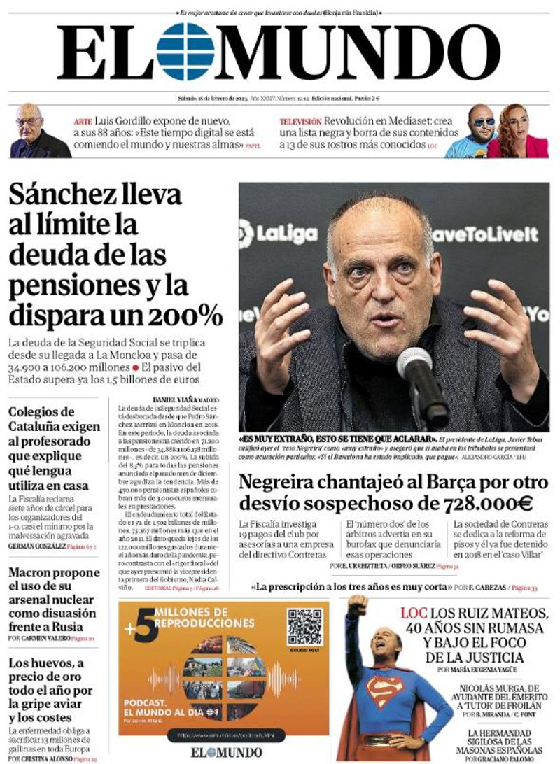 EL MUNDO: "Sánchez lleva al límite la deuda de las pensiones y la dispara un 200%"; "Negreira chantajeó al Barça por otro desvío sospechoso de 728.00 euros"; "Colegios de Cataluña exigen al profesorado que explique qué lengua utiliza en casa"; "Macron propone el uso de su arsenal nuclear como disuasión frente a Rusia"; "Los huevos, a precio de oro todo el año por la gripe aviar y los costes".