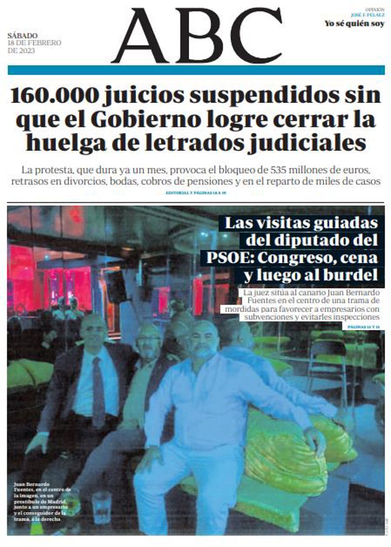 ABC: "160.000 juicios suspendidos sin que el Gobierno logre cerrar la huelga de letrados judiciales. La protesta, que dura ya un mes, provoca el bloqueo de 535 millones de euros, retrasos en divorcios, bodas, cobros de pensiones y en el reparto de miles de casos"; "Las visitas guiadas del diputado del PSOE: Congreso, cena y luego al burdel. La juez sitúa al canario Juan Bernardo Fuentes en el centro de una trama de mordidas para favorecer a empresarios con subvenciones y evitarles inspecciones".