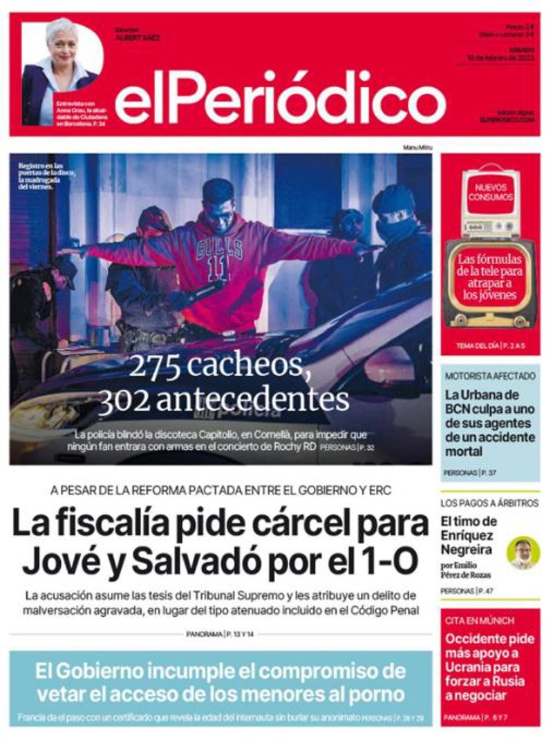 EL PERIÓDICO: "La fiscalía pide cárcel para Jové y Salvadó por el 1-O"; "El Gobierno incumple el compromiso de vetar el acceso de los menores al porno"; "La Urbana de BCN culpa a uno de sus agentes de un accidente mortal"; "Occidente pide más apoyo a Ucrania para forzar a Rusia a negociar".
