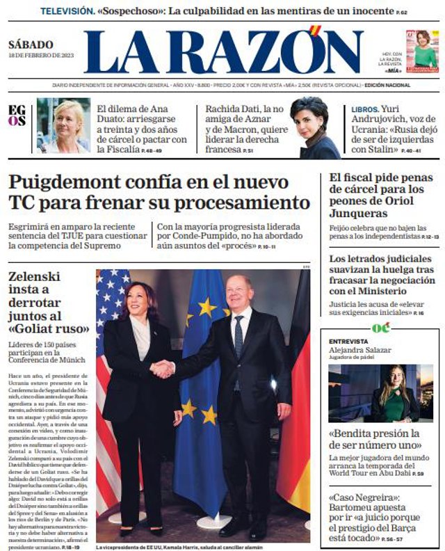 LA RAZÓN: "Puigdemont confía en el nuevo TC para frenar su procesamiento"; "Zelenski insta a derrotar juntos al "Goliat ruso""; "El fiscal pide penas de cárcel para los peones de Oriol Junqueras"; "Los letrados judiciales suavizan la huelga tras fracasar la negociación con el Ministerio".