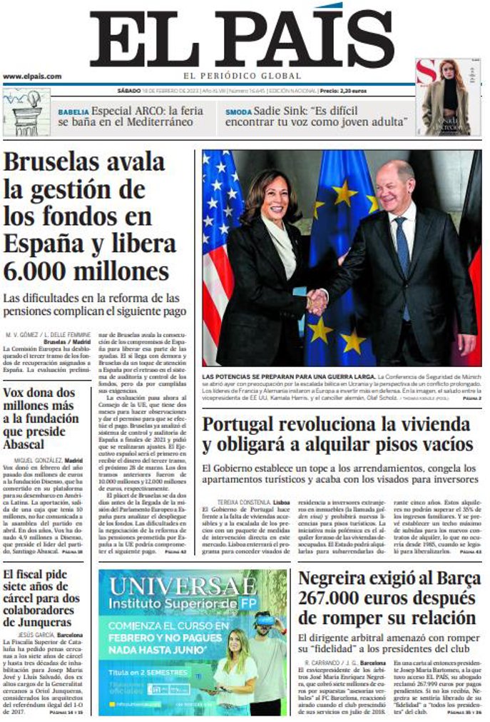 EL PAÍS: "Bruselas avala la gestión de los fondos en España y libera 6.000 millones"; "Portugal revoluciona la vivienda y obligará a alquilar pisos vacíos"; "Negreira exigió al Barça 267.000 euros después de romper su relación"; "Vox dona dos millones más a la fundación que preside Abascal"; "El fiscal pide siete años de cárcel para dos colaboradores de Junqueras".