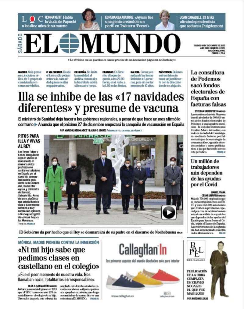 EL MUNDO: "Illa se inhibe de las "17 navidades diferentes" y presume de vacuna. Pitos para Illa y Vivas al Rey: Los Reyes Felipe y Letizia inauguraron ayer en Madrid el monumento en memoria de los profesionales sanitarios fallecidos en España por el Covid-19"; "El Gobierno da por hecho que el Rey se desmarcará de su padre en el discurso de Nochebuena"; "Mónica, madre pionera contra la inmersión: "Ni mi hijo sabe que pedimos clases en castellano en el colegio""; "La consultora de Podemos sacó fondos electorales de España con facturas falsas"; "Un millón de trabajadores aún dependen de las ayudas por el Covid".