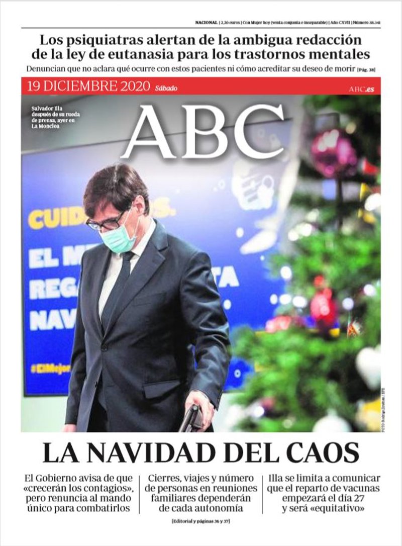ABC: "La Navidad del caos. El Gobierno avisa de que "crecerán los contagios", pero renuncia al mando único para combatirlos. Cierres, viajes y número de personas en reuniones familiares dependerán de cada autonomía. Illa se limita a comunicar que el reparto de vacunas empezará el día 27 y será "equitativo""; "Los psiquiatras alertan de la ambigua redacción de la ley de eutanasia para los trastornos mentales. Denuncian que no aclara qué ocurre con estos pacientes ni cómo acreditar su deseo de morir".