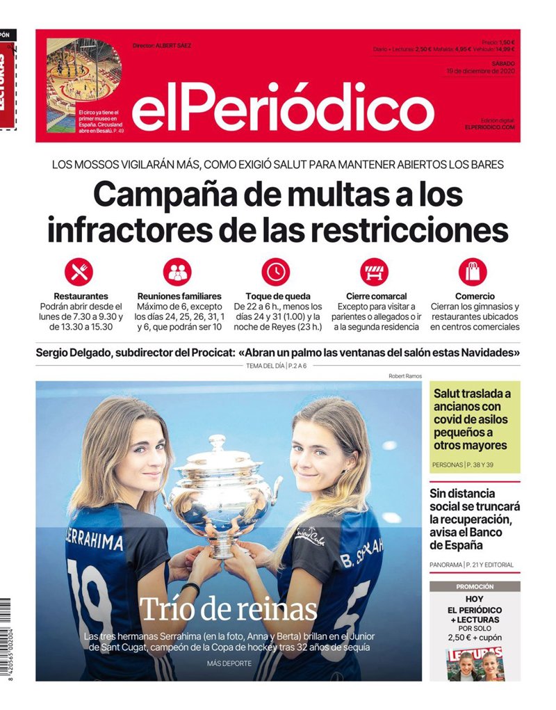 EL PERIÓDICO: "Campaña de multas a los infractores de las restricciones. Sergio Delgado, subdirector del Procicat: "Abran un palmo las ventanas del salón estas Navidades""; "Trío de reinas. Las tres hermanas Serrahima brillan en el Junio de Sant Cugat, campeón de la Copa de hockey tras 32 años de sequía"; "Salut traslada a ancianos con covid de asilos pequeños a otros mayores"; "Sin distancia social se truncará la recuperación, avisa el Banco de España".