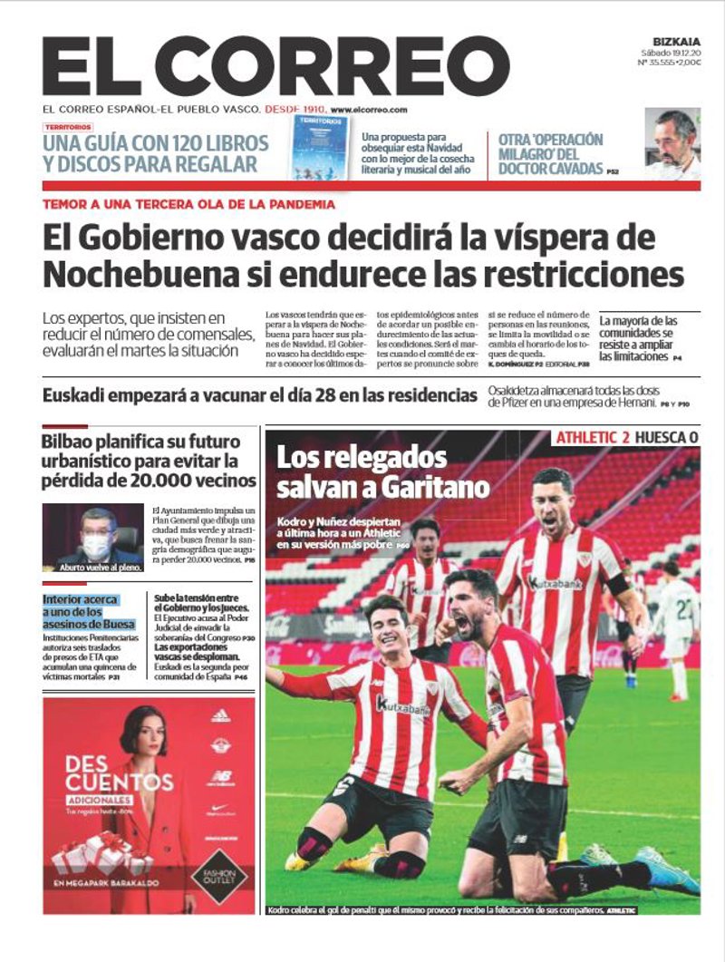 EL CORREO: "El Gobierno vasco decidirá la víspera de Nochebuena si endurece las restricciones"; "Euskadi empezará a vacunar el día 28 en las residencias"; "Los relegados salvan a Garitano. Kodro y Nuñez despiertan a última hora a un Athletic en su versión más pobre"; "Bilbao planifica su futuro urbanístico para evitar la pérdida de 20.000 vecinos"; "Interior acerca a uno de los asesinos de Buesa".