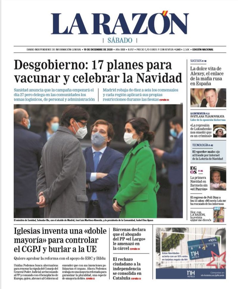 LA RAZÓN: "Desgobierno: 17 planes para vacunar y celebrar la Navidad"; "Iglesias inventa una "doble mayoría" para controlar el CGPJ y burlar a la UE"; "Bárcenas declara que el abogado del PP "el Largo" le amenazó en la cárcel"; "El rechazo ciudadano a la independencia se consolida en Cataluña"; "La dolce vita de Alexey, el enlace de la ma?a rusa en España"; "Svetlana Tijanovskaya, lider de la oposición bielorrusa: "La represión de Lukashenko nos enseñó que es un criminal"".