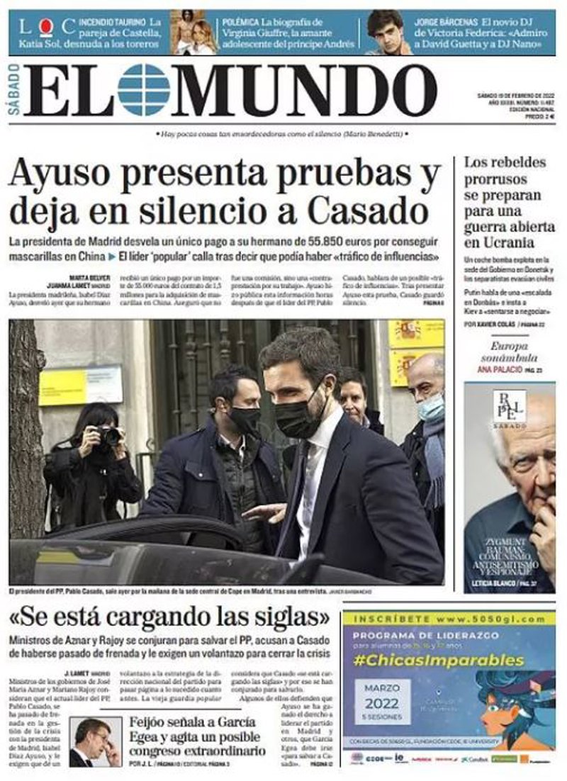 EL MUNDO: "Ayuso presenta pruebas y deja en silencio a Casado"; ""Se está cargando las siglas". Ministros de Aznar y Casado se conjuran para salvar al PP, acusan a Casado de haberse pasado de frenada y le exigen un volantazo para cerrar la crisis"; "Feijóo señala a García Egea y agita un posible congreso extraordinario"; "Los rebeldes prorrusos se preparan para una guerra abierta en Ucrania".