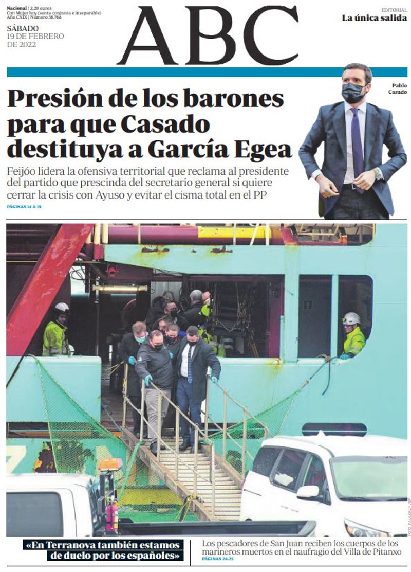 ABC: "Presión de los barones para que Casado destituya a García Egea. Feijóo lidera la ofensiva territorial que reclama al presidente del partido que prescinda del secretario general si quiere cerrar la crisis con Ayuso y evitar el cisma total en el PP"; ""En Terranova también estamos de duelo por los españoles". Los pescadores de San Juan reciben los cuerpos de los marineros muertos en el naufragio del Villa de Pitanxo".