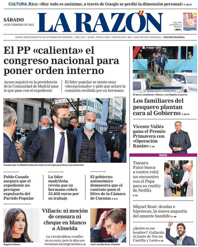 LA RAZÓN: "El PP "calienta" el congreso nacional para poner orden interno"; "Villacís: ni moción de censura ni cheque en blanco a Almeida"; "Los familiares del pesquero plantan cara al Gobierno"; "Vicente Vallés gana el Premio Primavera con "Operación Kazán"".
