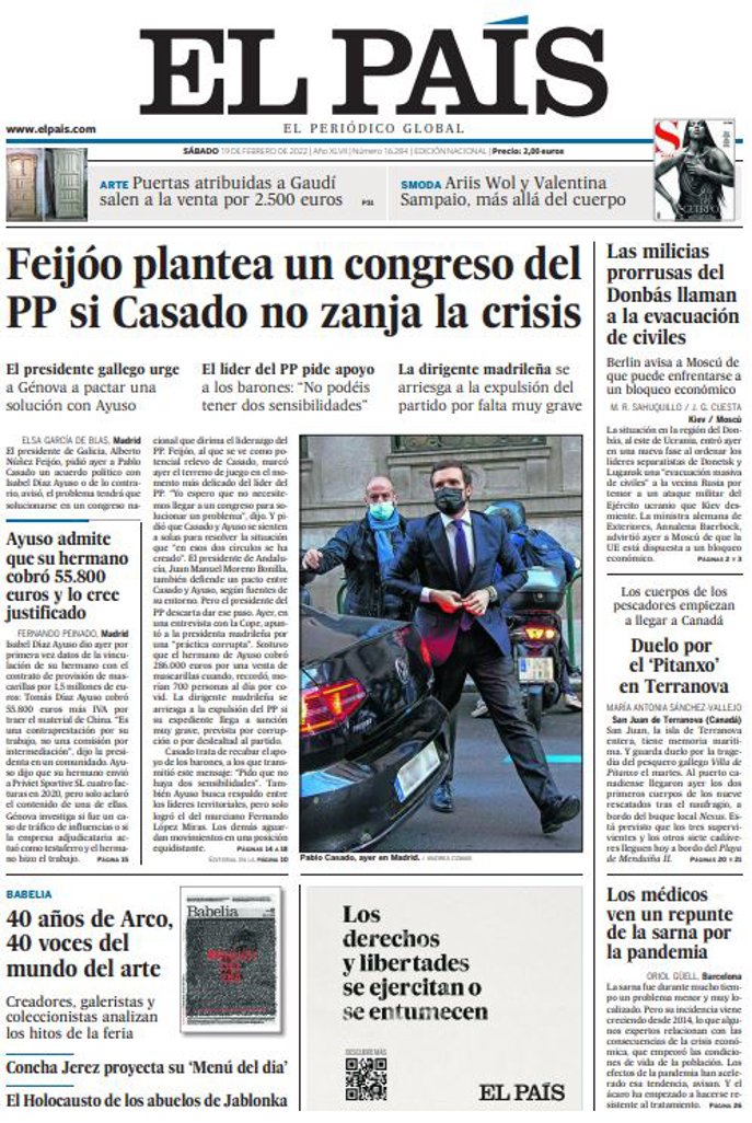 EL PAÍS: "Feijóo plantea un congreso del PP si Casado no zanja la crisis"; "Ayuso admite que su hermano cobró 55.800 euros y lo cree justificado"; "Las milicias prorrusas del Donbás llaman a la evacuación de civiles"; "Los cuerpos de los pescadores empiezan a llegar a Canadá. Duelo por el 'Pitanxo' en Terranova"; "Los médicos ven un repunte de la sarna por la pandemia".
