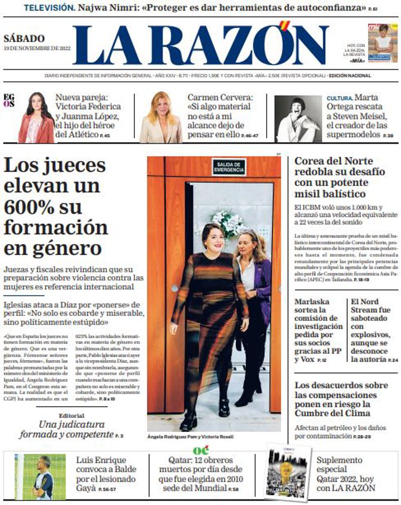 LA RAZÓN: "Los jueces elevan un 600% su formación en género"; "Corea del Norte redobla su desafío con un potente misil balístico"; "Marlaska sortea la comisión de investigación pedida por sus socios gracias al PP y Vox"; "El Nord Stream fue saboteado con explosivos, aunque se desconoce la autoría".
