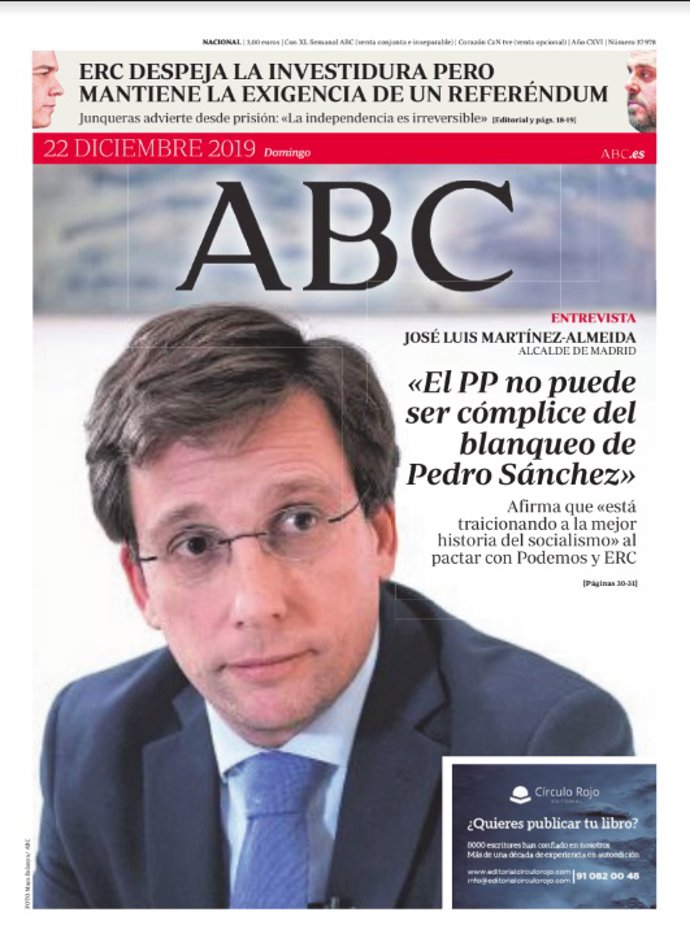 ABC: "José Luis Martínez-Almeida: 'El PP no puede ser cómplice del blanqueo de Pedro Sánchez"; "ERC despeja la investidura pero mantiene el referéndum"; "Junqueras advierte desde prisión: 'La independencia es irreversible".