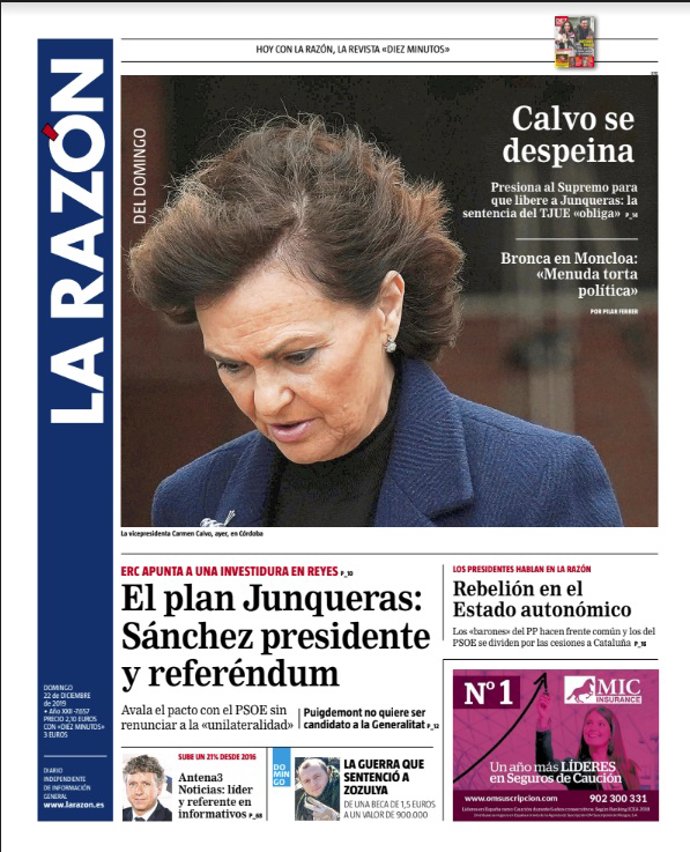 LA RAZÓN: "Calvo se despeina. Presiona al Supremo para que libere a Junqueras: la sentencia del TJUE 'obliga'"; "Bronca en Moncloa: 'Menuda torta política"; "El plan Junqueras: Sánchez presidente y referéndum"; "Rebelión en el Estado autonómico".