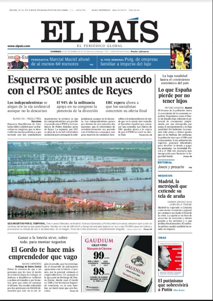 EL PAÍS: "Esquerra ve posible un acuerdo con el PSOE antes de Reyes"; "Lo que España pierde por no tener hijos"; "Madrid, la metrópoli que extiende su tela de araña"; "Marcial Maciel abusó de al menos 60 menores"; "Puig, de empresa familiar a imperio de lujo"; "El Gordo te hace más emprendedor que vago".