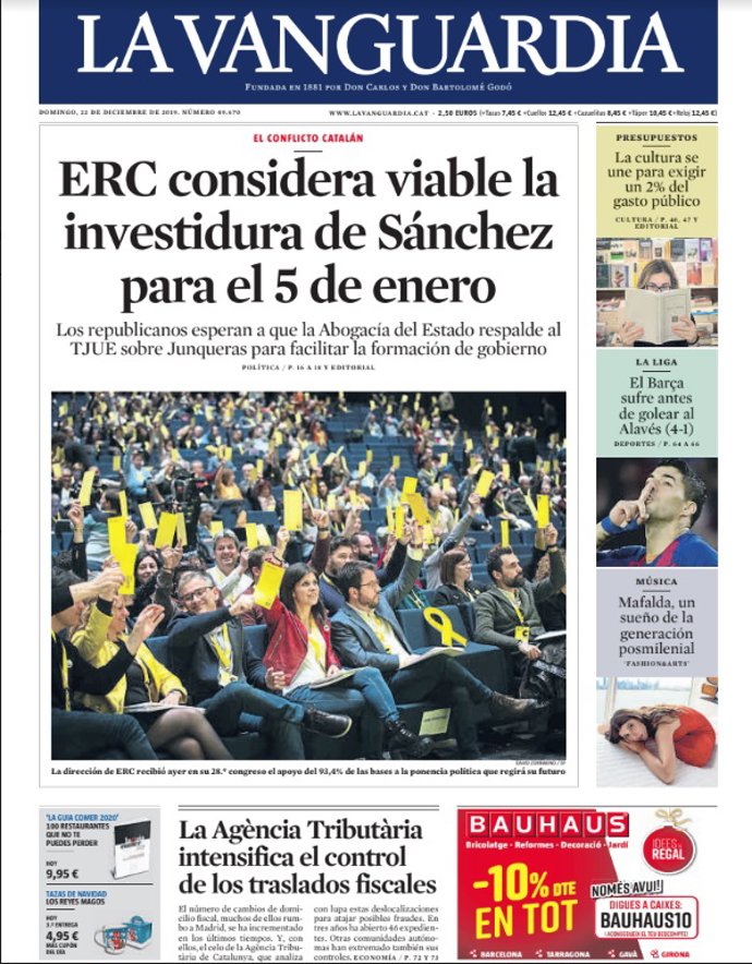 LA VANGUARDIA: "ERC considera viable la investidura de Sánchez para el 5 de enero"; "Los republicanos esperan a que la Abogacía del Estado respalde al TJUE sobre Junqueras para facilitar la formación de gobierno"; "La Agencia Tributaria intensifica el control de los traslados fiscales".