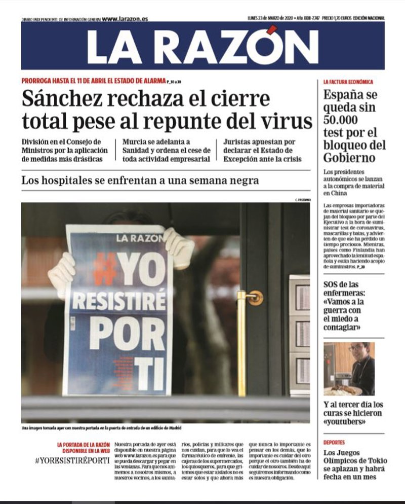 LA RAZÓN: "Sánchez rechaza el cierre total pese al repunte del virus. Los hospitales se enfrentan a una semana negra"; "España se queda sin 50.000 test por el bloqueo del Gobierno"; "SOS de las enfermeras: "Vamos a la guerra con el miedo a contagiar""; "Y al tercer día los curas se hicieron "youtubers""; "Los Juegos Olímpicos de Tokio se aplazan y habrá fecha en un mes".