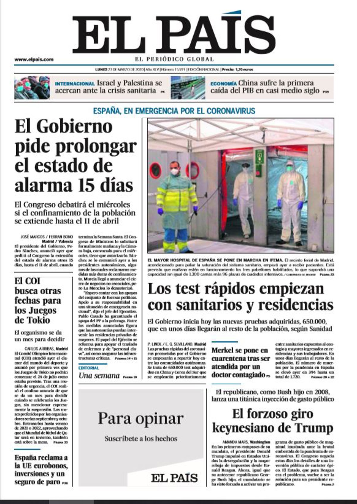 EL PAÍS: "El Gobierno pide prolongar el estado de alarma 15 días"; "Los test rápidos empiezan con sanitarios y residencias. Merkel se pone en cuarentena tras ser atendida por un doctor contagiado"; "El forzoso giro keynesiano de Trump"; "El COI busca otras fechas para los Juegos de Tokio"; "España reclama a la UE eurobonos, inversiones y un seguro de paro".