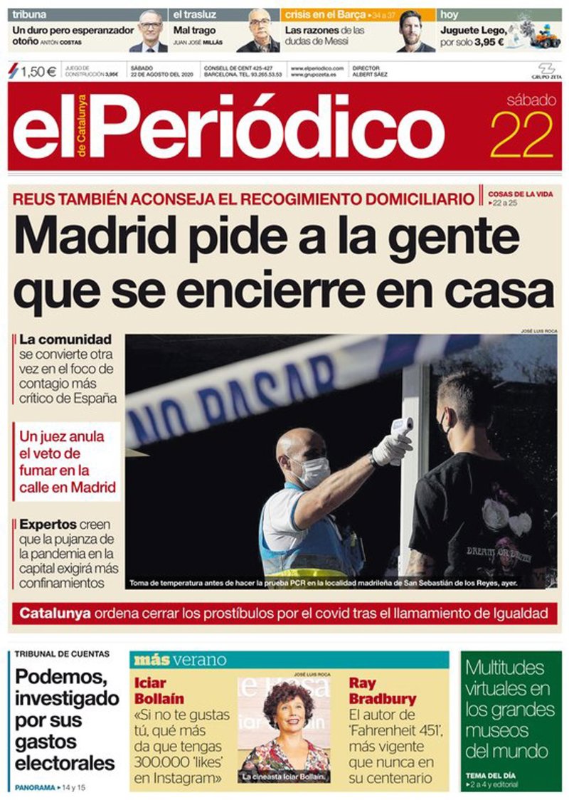 EL PERIÓDICO: "Madrid pide a la gente que se encierre en casa"; "Catalunya ordena cerrar los prostíbulos por el covid tras el llamamiento de Igualdad"; "Podemos, investigado por sus gastos electorales"; "Multitudes virtuales en los grandes museos del mundo".