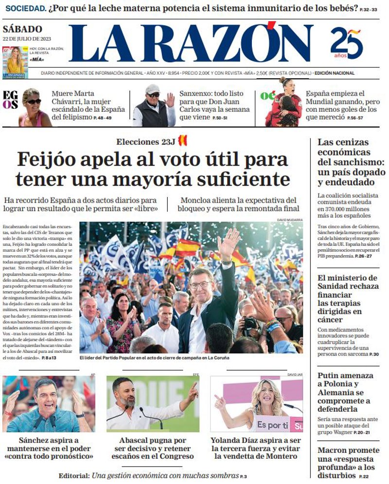 LA RAZÓN: "Feijóo apela al voto útil para tener una mayoría suficiente"; "Sánchez aspira a mantenerse en el poder "contra todo pronóstico""; "Abascal pugna por ser decisivo y retener escaños en el Congreso"; "Yolanda Díaz aspira a ser la tercera fuerza y evitar la vendetta de Montero"; "Las cenizas económicas del sanchismo: un país dopado y endeudado"; "El ministerio de Sanidad rechaza financiar las terapias dirigidas en cáncer"; "Putin amenaza a Polonia y Alemania se compromete a defenderla"; "Macron promete una "respuesta profunda" a los disturbios".