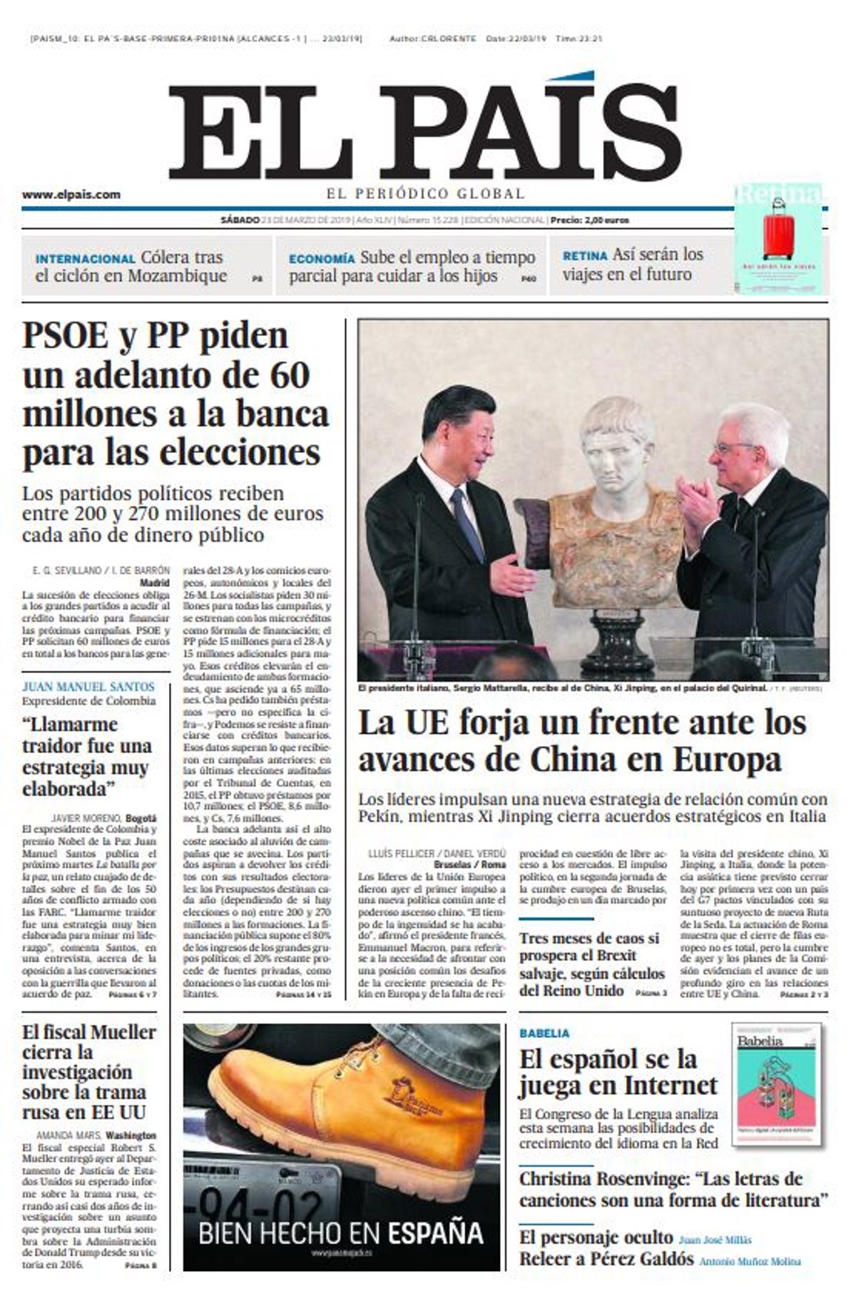 EL PAÍS: "PSOE y PP piden un adelanto de 60 millones a la banca para las elecciones"; "La UE forja un frente ante los avances de China en Europa"; "El fiscal Mueller cierra la investigación sobre la trama rusa en EE UU"; "Christina Rosenvinge: 'Las letras de canciones son una forma de literatura'".