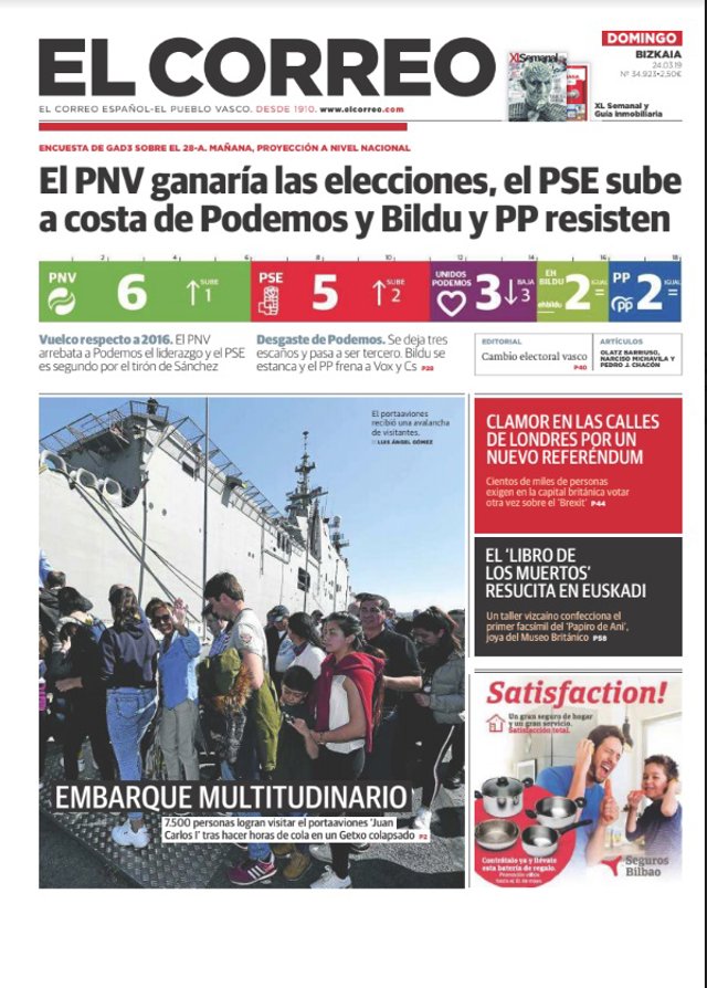 EL CORREO: "El PNV ganaría las elecciones, el PSE sube a costa de Podemos y Bildu y PP resisten"; "El PNV arrebata a Podemos el liderazgo y el PSE es segundo por le tirón de Sánchez".