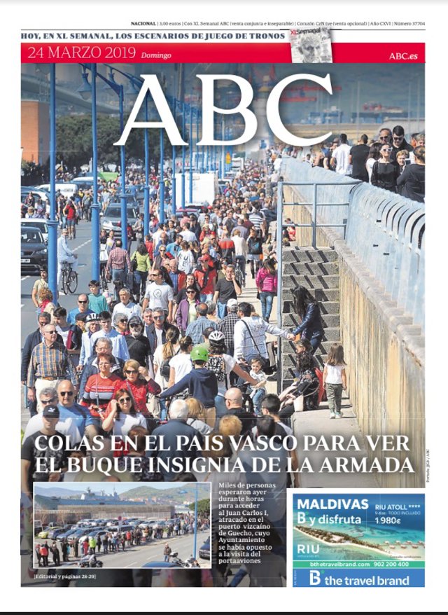 ABC: "Colas en el País Vasco para ver el buque insignia de la armada"; "La fragmentación de la derecha da al PSOE la mitad de las circunscripciones"; "Marcha histórica a favor de Europa en Londres"; "Daesh pierde su 'califato' territorial tras la caída del último feudo en Siria"; "Los 5.000 supervivientes del terrorismo, las víctimas invisibles de la barbarie".