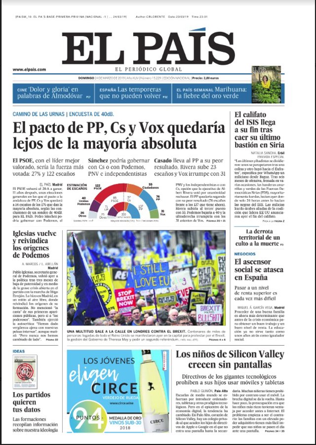 EL PAÍS: "EL pacto de PP, Cs y Vox quedaría lejos de la mayoría absoluta"; "Iglesias vuelve y reivindica los orígenes de Podemos"; "El califato del ISIS llega a su fin tras caer su último bastión en Siria"; "El ascensor social se atasca en España"; "Los niños de Silicon Valley crecen sin pantallas".