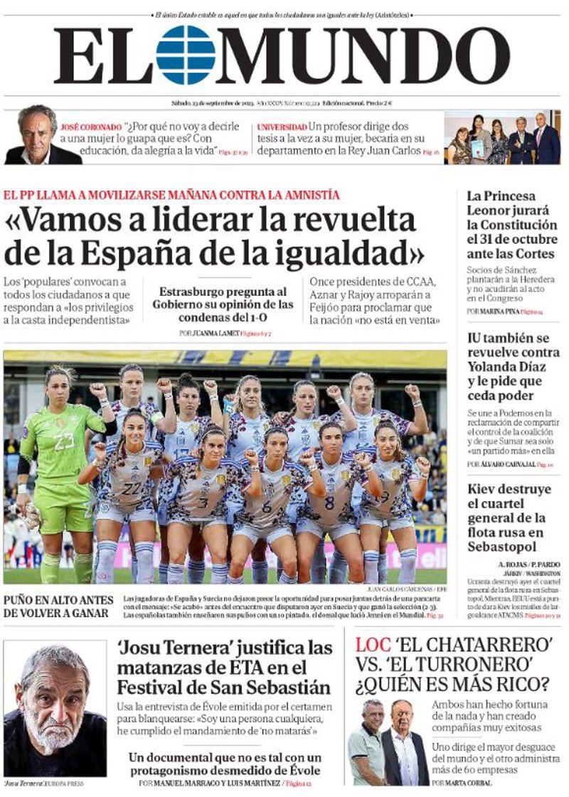 EL MUNDO: ""Vamos a liderar la revuelta de la España de la igualdad""; "'Josu Ternera' justifica las matanzas de ETA en el Festival de San Sebastián"; "La Princesa Leonor jurará la Constitución el 31 de octubre ante las Cortes"; "IU también se revuelve contra Yolanda Díaz y le pide que ceda poder"; "Kiev destruye el cuartel general de la flota rusa en Sebastopol".