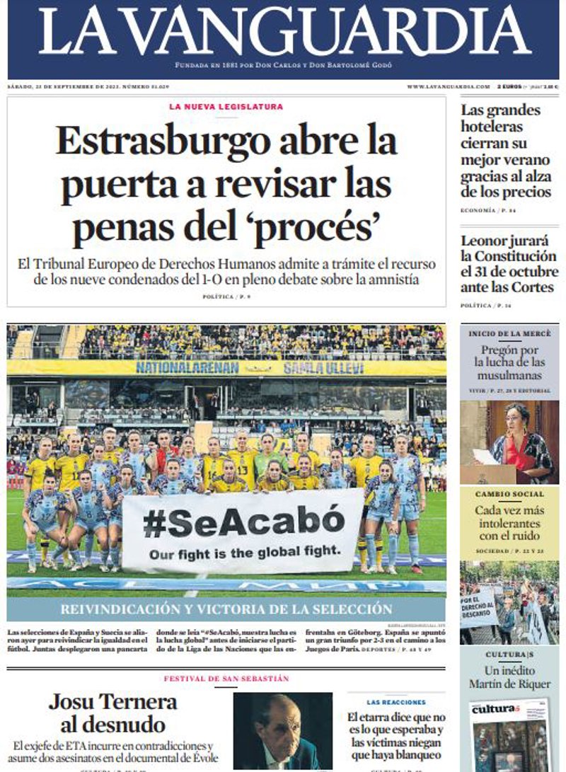 LA VANGUARDIA: "Estrasburgo abre la puerta a revisar las penas del 'procés'"; "Las grandes hoteleras cierran su mejor verano gracias al alza de los precios"; "Leonor jurará la Constitución el 31 de octubre ante las Cortes"".