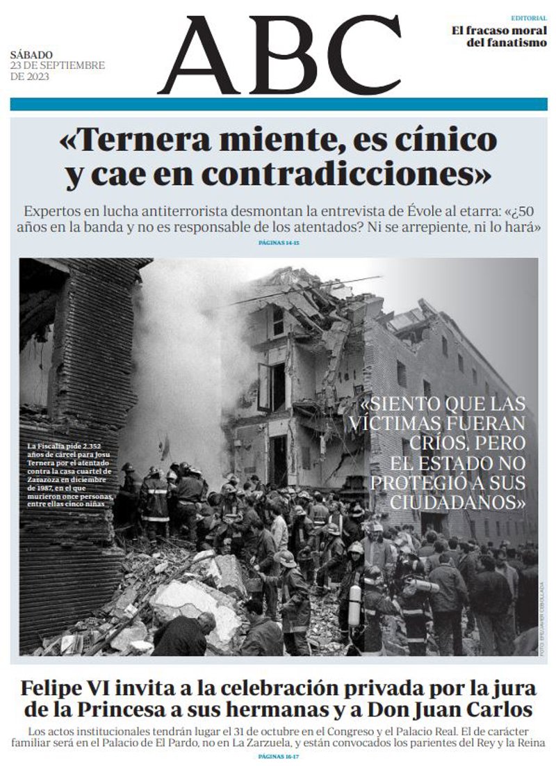 ABC: ""Ternera miente, es cínico y cae en contradicciones" Expertos en lucha antiterrorista desmontan la entrevista de Évole al etarra: "¿50 años en la banda y no es responsable de los atentados? Ni se arrepiente, ni lo hará""; "Felipe VI invita a la celebración privada por la jura de la Princesa a sus hermanas y a Don Juan Carlos".