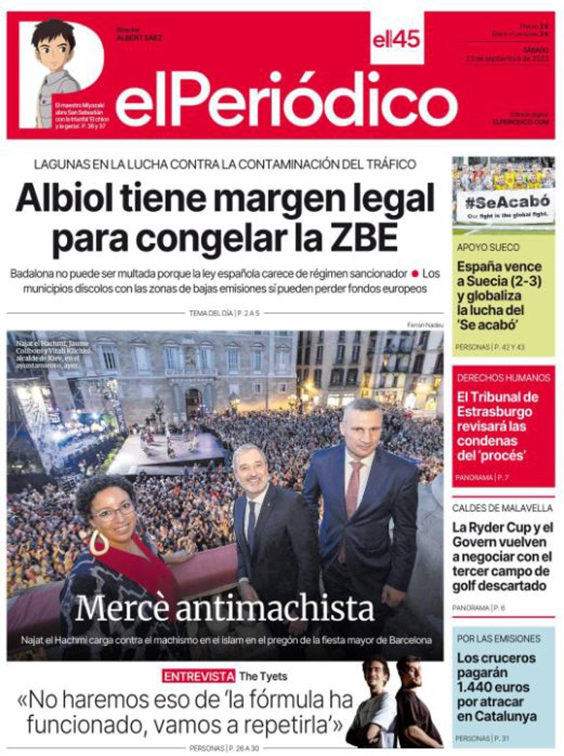 EL PERIÓDICO: "Albiol tiene margen legal para congelas la ZBE"; "Mercè antimachiste"; "The Tyets: "No haremos eso de 'la fórmula ha funcionado, vamos a repetirla'"; "España vence a Suecia y globaliza la lucha del 'Se acabó'"; "El Tribunal de Estrasburgo revisará las condenas del 'procés'"; "La Ryder Cup y el Govern vuelven a negociar con el tercer campo de golf descartado"; "Los cruceros pagarán 1.440 euros por atracar en Catalunya".