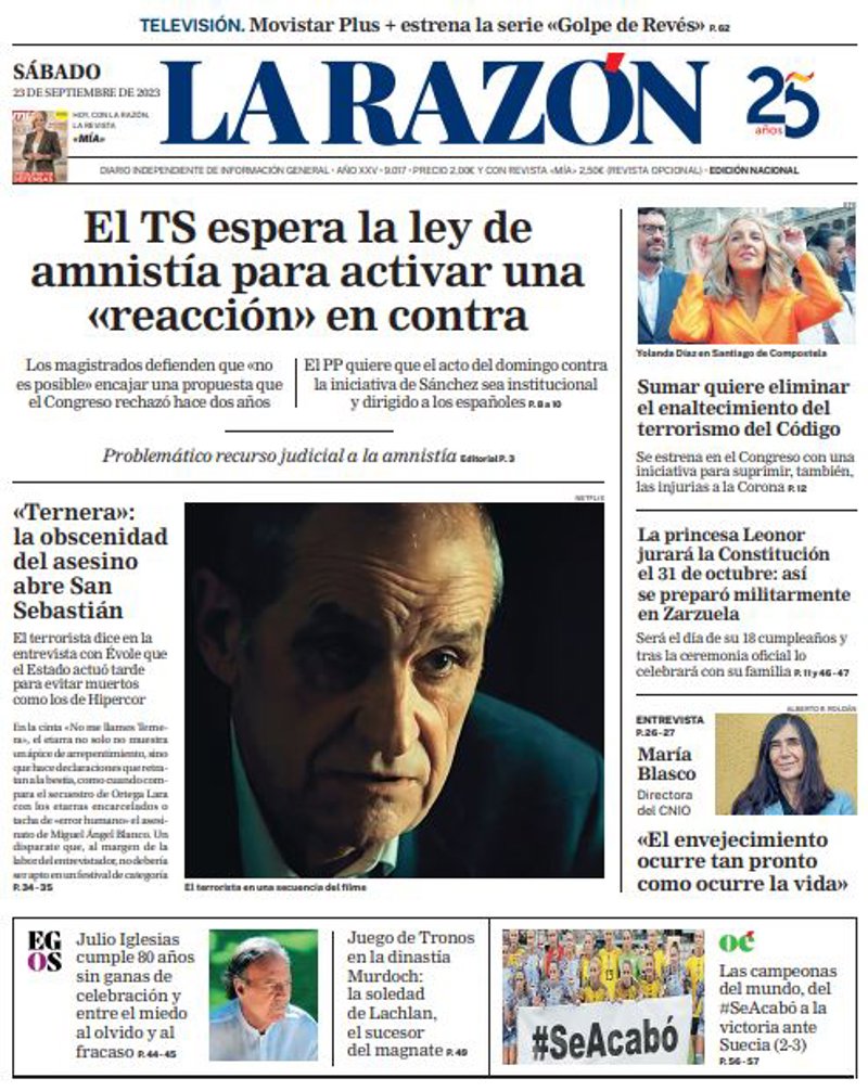 LA RAZÓN: "El TS espera la ley de amnistía para activar una "reacción" en contra"; ""Ternera": la obscenidad del asesino abre San Sebastián"; "Sumar quiere eliminar el enaltecimiento del