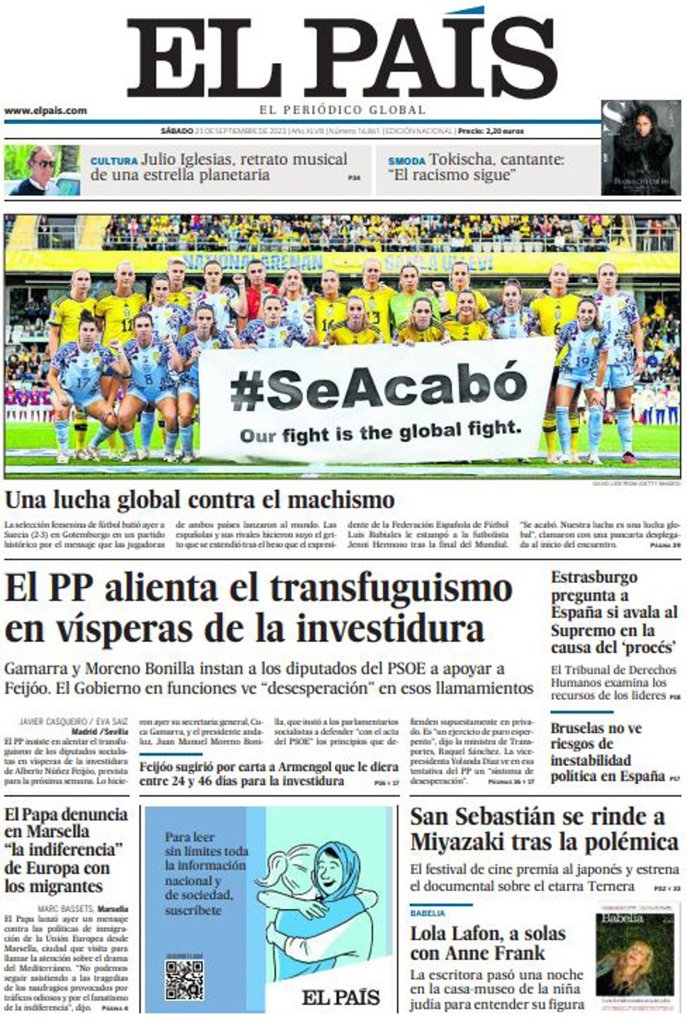 EL PAÍS: "El PP alienta el transfuguismo en vísperas de la investidura"; "El Papa denuncia en Marsella "la indiferencia" de Europa con los migrantes"; "Estrasburgo pregunta a España si avala al Supremo en la causa del 'procés'"; "Bruselas no ve riesgos de inestabilidad política en España"; "Una lucha global contra el machismo"; "San Sebastián se rinde a Miyazaki tras la polémica".