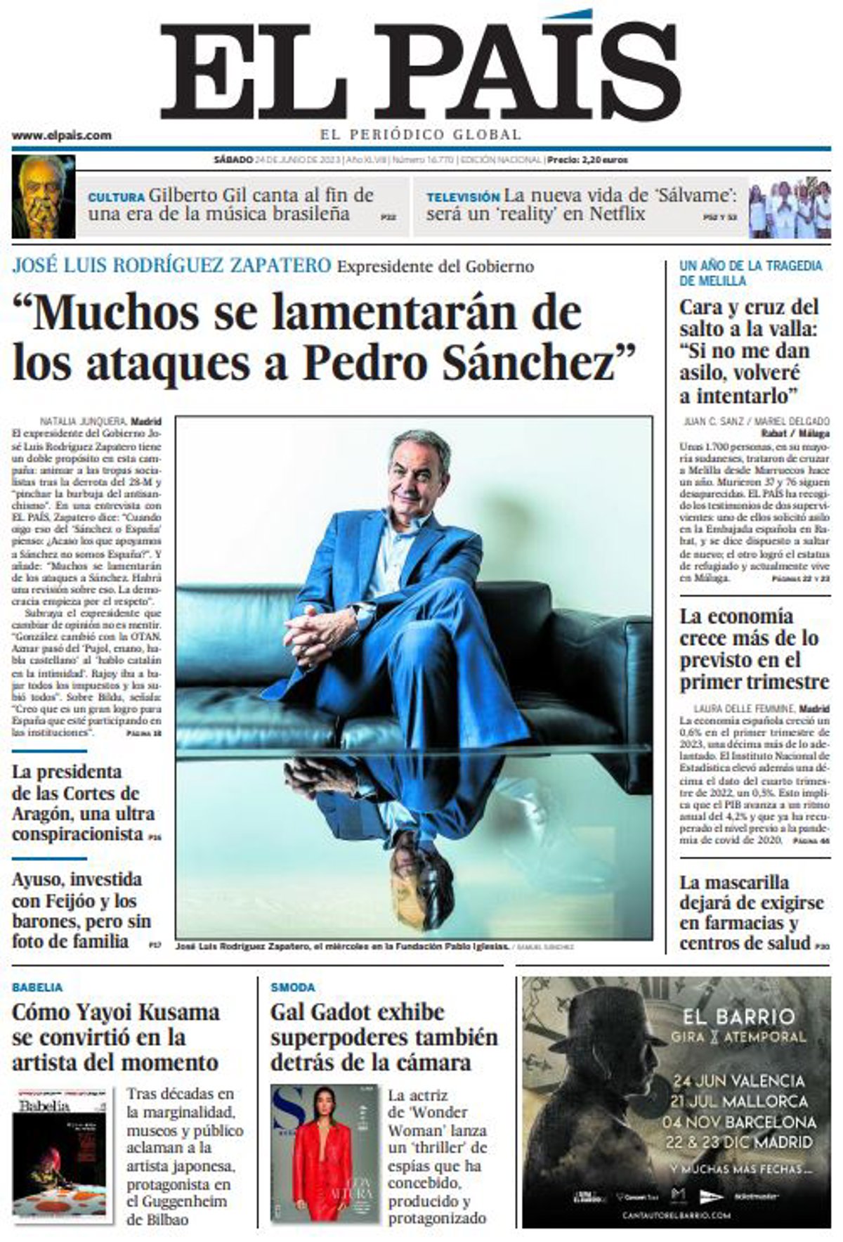 EL PAÍS: "José Luis Rodríguez Zapatero, expresidente del Gobierno: "Muchos se lamentarán de los ataques a Pedro Sánchez""; "Cara y cruz del salto a la valla: "Si no me dan asilo, volveré a intentarlo""; "La economía crece más de lo previsto en el primer trimestre"; "La mascarilla dejará de exigirse en farmacias y centros de salud".