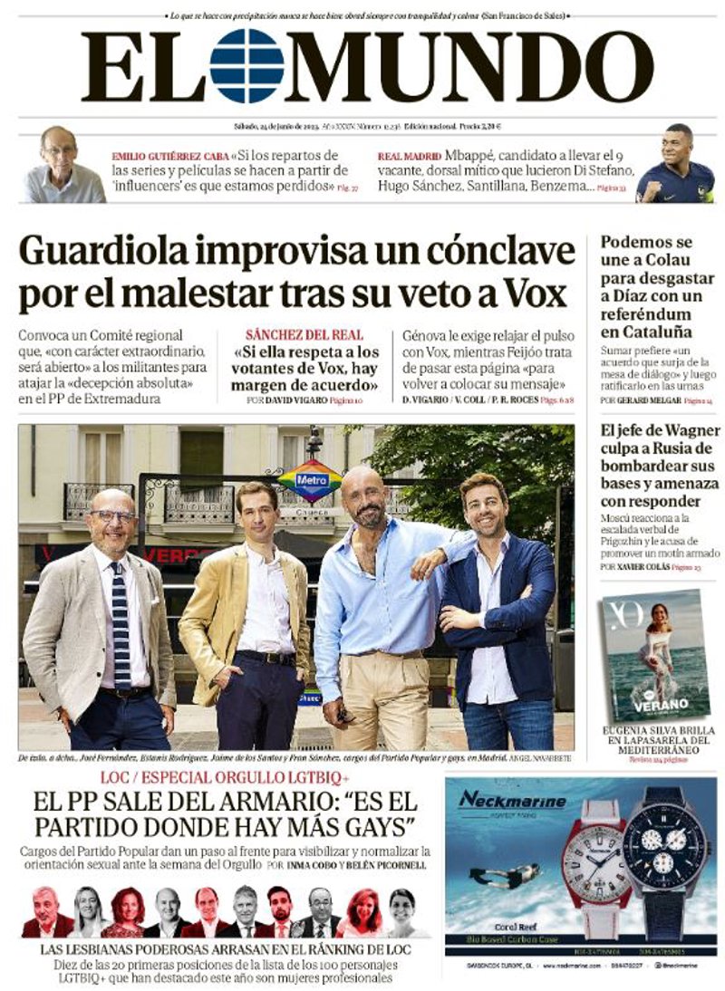 EL MUNDO: "Guardiola improvisa un cónclave por el malestar tras su veto a Vox"; "Podemos se una a Colau para desgastar a Díaz con un referéndum en Cataluña"; "El jefe de Wagner culpa a Rusia de bombardear sus bases y amenaza con responder".