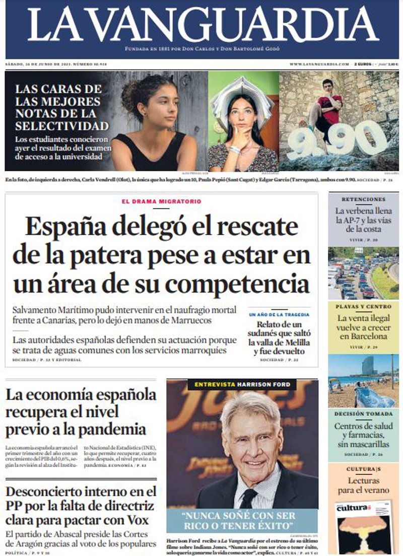 LA VANGUARDIA: "España delegó el rescate de la patera pese a estar en un área de su competencia"; "La economía española recupera el nivel previo a la pandemia"; "Desconcierto interno en el PPpor la falta de directriz clara para pactar con Vox".