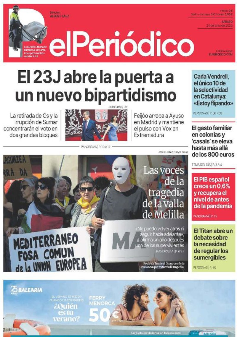 EL PERIÓDICO: "El 23J abre la puerta a un nuevo bipartidismo"; "Las voces de la tragedia de la valla de Melilla"; "Carla Vendrell, el único 10 de la selectividad en Catalunya: "Estoy flipando""; "El gasto familiar en colonias y 'casals' se eleva hasta más allá de los 800 euros"; "El PIB español crece un 0,6% y recupera el nivel de antes de la pandemia"; "El Titan abre un debate sobre la necesidad de regular los sumergibles".
