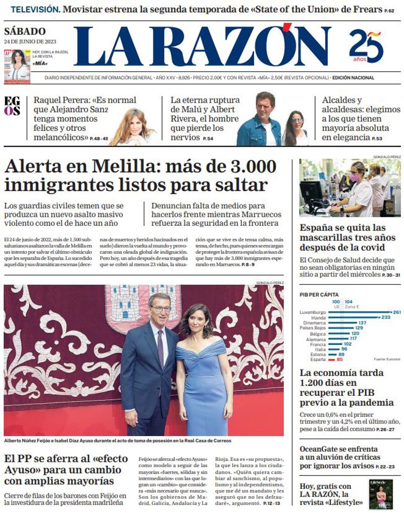 LA RAZÓN: "Alerta en Melilla: más de 3.000 inmigrantes listos para saltar"; "El PP se aferra al "efecto Ayuso" para un cambio con amplias mayorías"; "España se quita las mascarillas tres años después de la covid"; "La economía tarda 1.200 días en recuperar el PIB previo a la pandemia"; "OceanGate se enfrenta a un aluvión de críticas por ignorar los avisos".