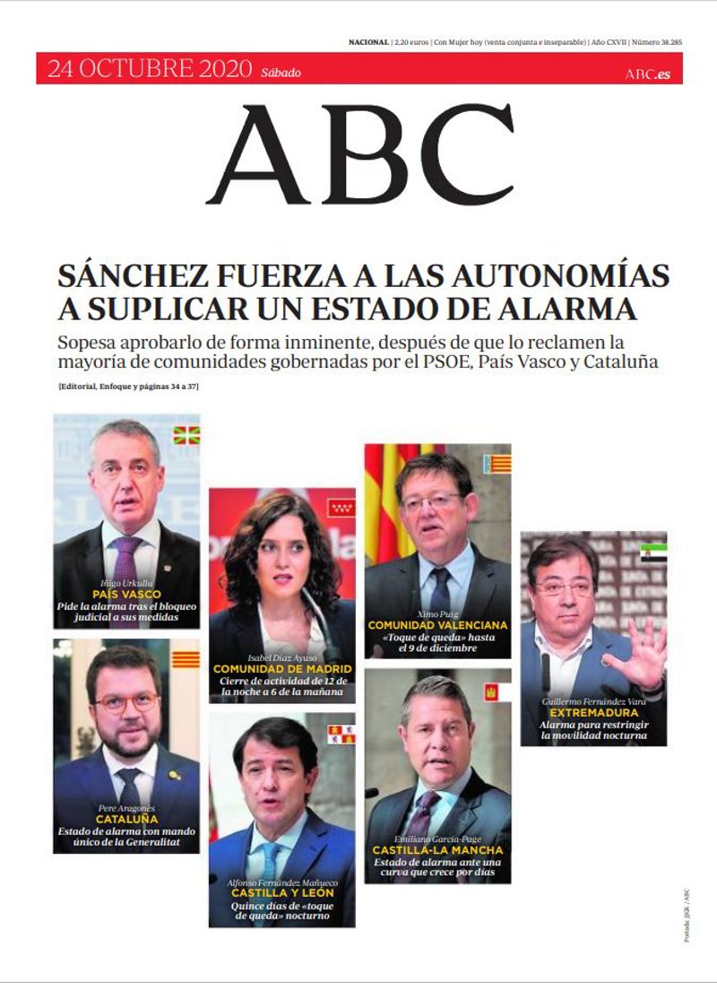 ABC: "Sánchez fuerza a las autonomías a suplicar un estado de alarma. Sopesa aprobarlo de forma inminente, después de que lo reclamen la mayoría de comunidades gobernadas por el PSOE, País Vasco y Cataluña".