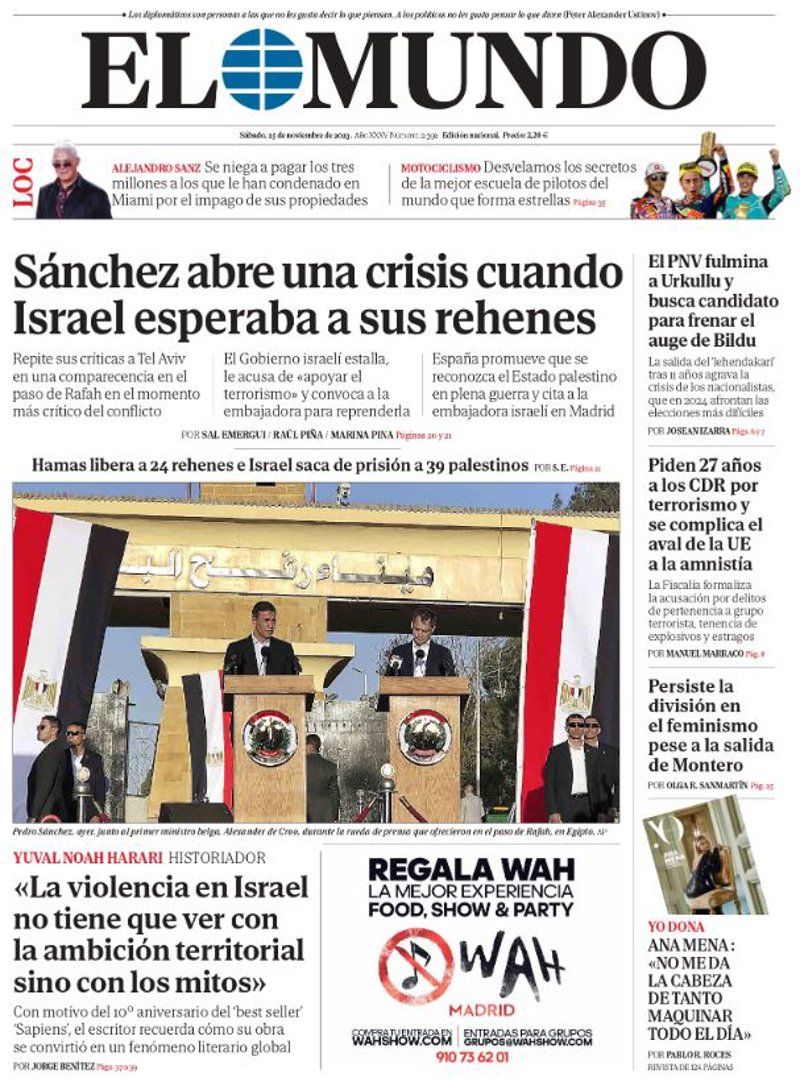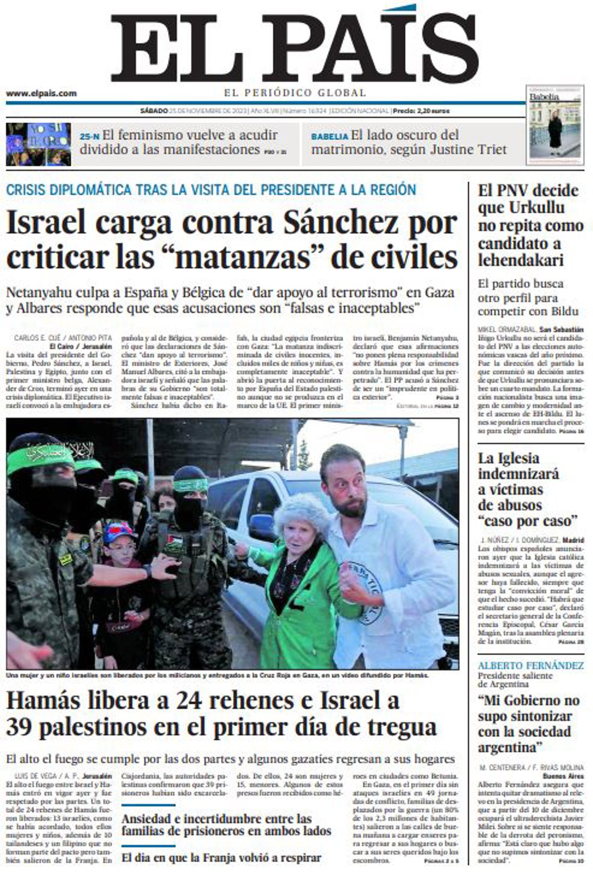 EL PAÍS: "Israel carga contra Sánchez por criticar las "matanzas" de civiles"; "Hamás libera a 24 rehenes e Israel a39 palestinos en el primer día de tregua"; "El PNV decide que Urkullu no repita como candidato a lehendakari"; "La Iglesia indemnizará a víctimas de abusos "caso por caso""; "Alberto Fernández, presidente saliente de Argentina: "Mi Gobierno no supo sintonizar con la sociedad argentina".