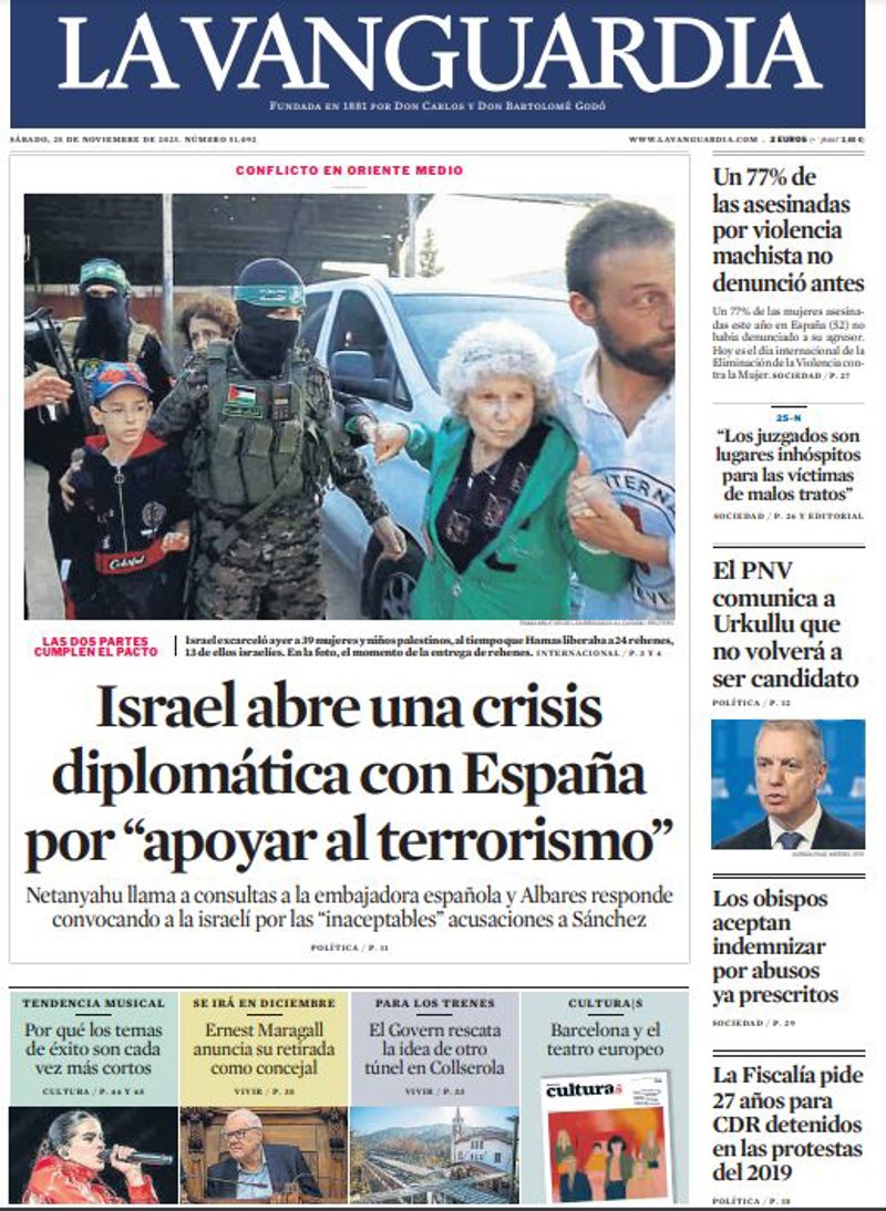LA VANGUARDIA: "Israel abre una crisis diplomática con España por "apoyar al terrorismo""; "Un 77% de las asesinadas por violencia machista no denunció antes"; "El PNV comunica a Urkullu que no volverá a ser candidato"; "Los obispos aceptan indemnizar por abusos