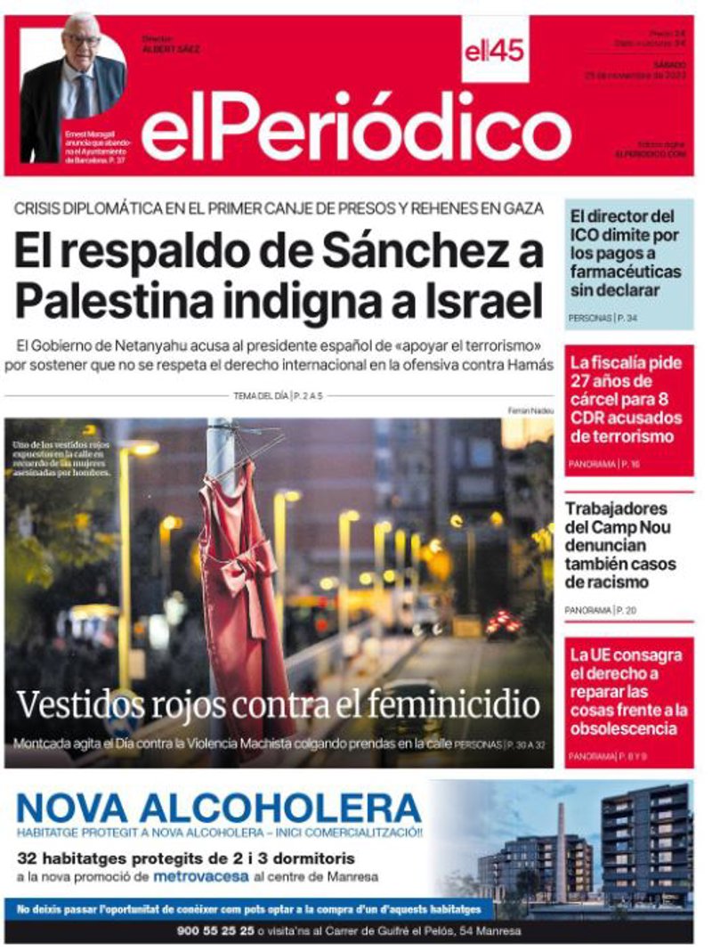 EL PERIÓDICO: "El respaldo de Sánchez a Palestina indigna a Israel"; "Vestidos rojos contra el feminicidio"; "El director del ICO dimite por los pagos a farmacéuticas sin declarar"; "La fiscalía pide 27 años de cárcel para 8 CDR acusados de terrorismo"; "Trabajadores del Camp Nou denuncian también casos de racismo".