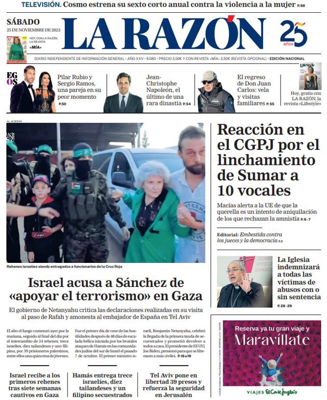 LA RAZÓN: "Israel acusa a Sánchez de "apoyar el terrorismo" en Gaza"; "Reacción en el CGPJ por el linchamiento de Sumar a 10 vocales".