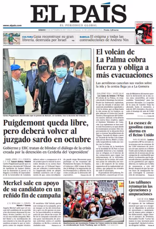 EL PAÍS: "Puigdemont queda libre, pero deberá volver al juzgado sardo en octubre"; "Merkel sale en apoyo de su candidato en un reñido fin de campaña"; "El volcán de La Palma cobra fuerza y obliga a más evacuaciones"; "La escasez de gasolina causa alarma en el Reino Unido"; "Los talibanes retomarán las ejecuciones y amputaciones".