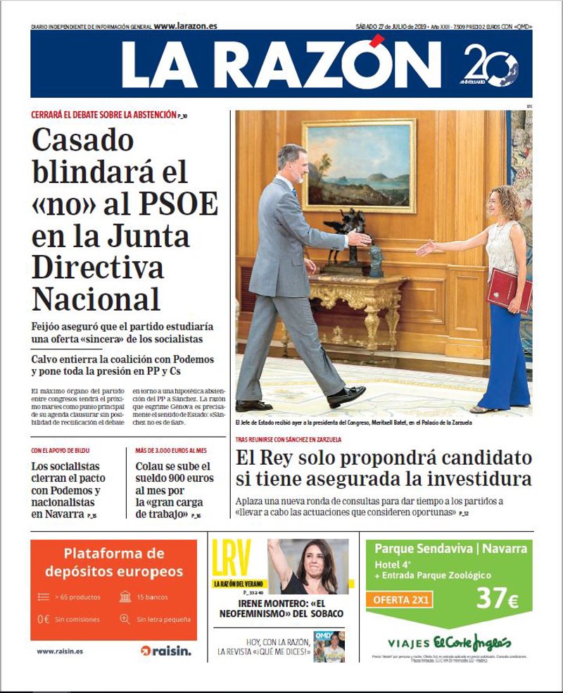 LA RAZÓN: "Casado blindará el "no" al PSOE en la Junta Directiva Nacional"; "El Rey solo propondrá candidato si tiene asegurada la investidura"; "Los socialistas cierran el pacto con Podemos y nacionalistas en Navarra"; "Colau se sube el sueldo 900 euros al mes por la "gran carga de trabajo"".