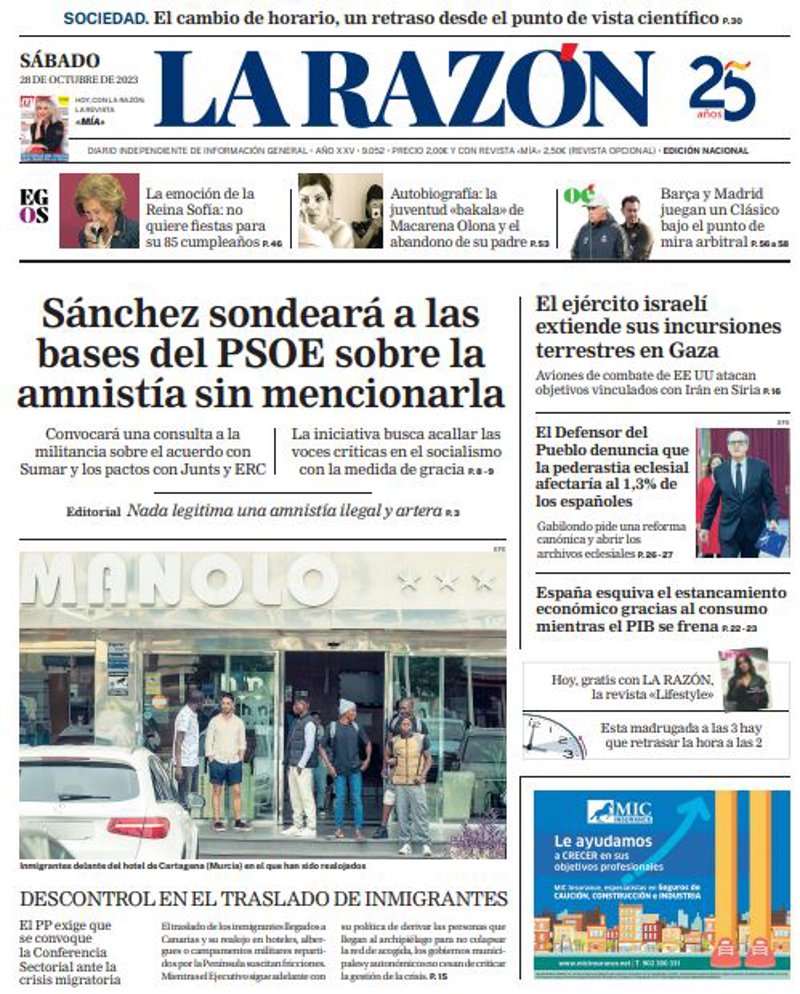 LA RAZÓN: "Sánchez sondeará a las bases del PSOE sobre la amnistía sin mencionarla"; "El ejército israelí extiende sus incursiones terrestres en Gaza"; "El Defensor del Pueblo denuncia que la pederastia eclesial afectaría al 1,3% de los españoles"; "España esquiva el estancamiento económico gracias al consumo mientras el PIB se frena".