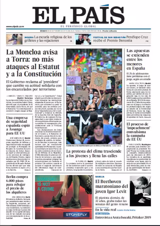 EL PAÍS: "La Moncloa avisa a Torra: no más ataques al Estatut y a la Constitución"; "Los protesta del clima trasciende a los jóvenes y llena las calles"; "Las apuestas se extienden entre los menores en España"; "El proceso de 'impeachment' convulsiona la campaña de EE UU"; "Una empresa de seguridad española espió a Assange para EE UU"; "Berlin compra 6.000 pisos para rebajar el precio de los alquileres"; "El Beethoven maratoniano del joven Igor Levit".