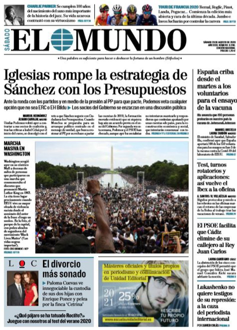 EL MUNDO: "Iglesias rompe la estrategia de Sánchez con los Presupuestos"; "Marcha masiva en Washingthon"; "España criba desde el martes a los voluntarios para el ensayo de la vacuna"; "Test, turnos rotatorios y aplicaciones: así vuelve el Ibex a la oficina"; "El PSOE facilita que Cádiz elimine de su callejero al Rey Juan Carlos"; "Lukashenko no quiere testigos de su represión: a la caza del periodista internacional".