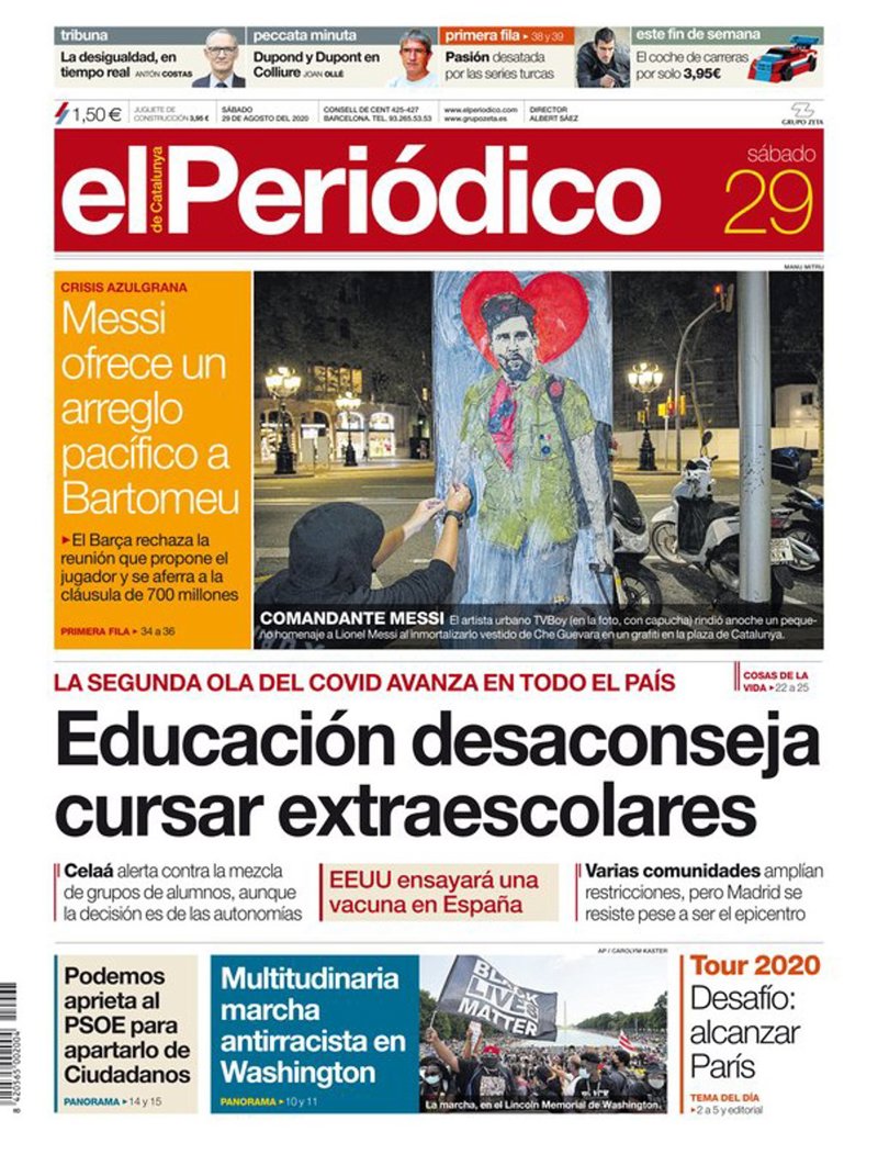 EL PERIÓDICO: "Educación desaconseja cursar extraescolares"; "Messi ofrece un arreglo pacífico a Bartomeu"; "Podemos aprieta al PSOE para apartarlo de Ciudadanos"; "Multitudinaria marcha antirracista en Washington"; "Tour 2020. Desafío: alcanzar París".